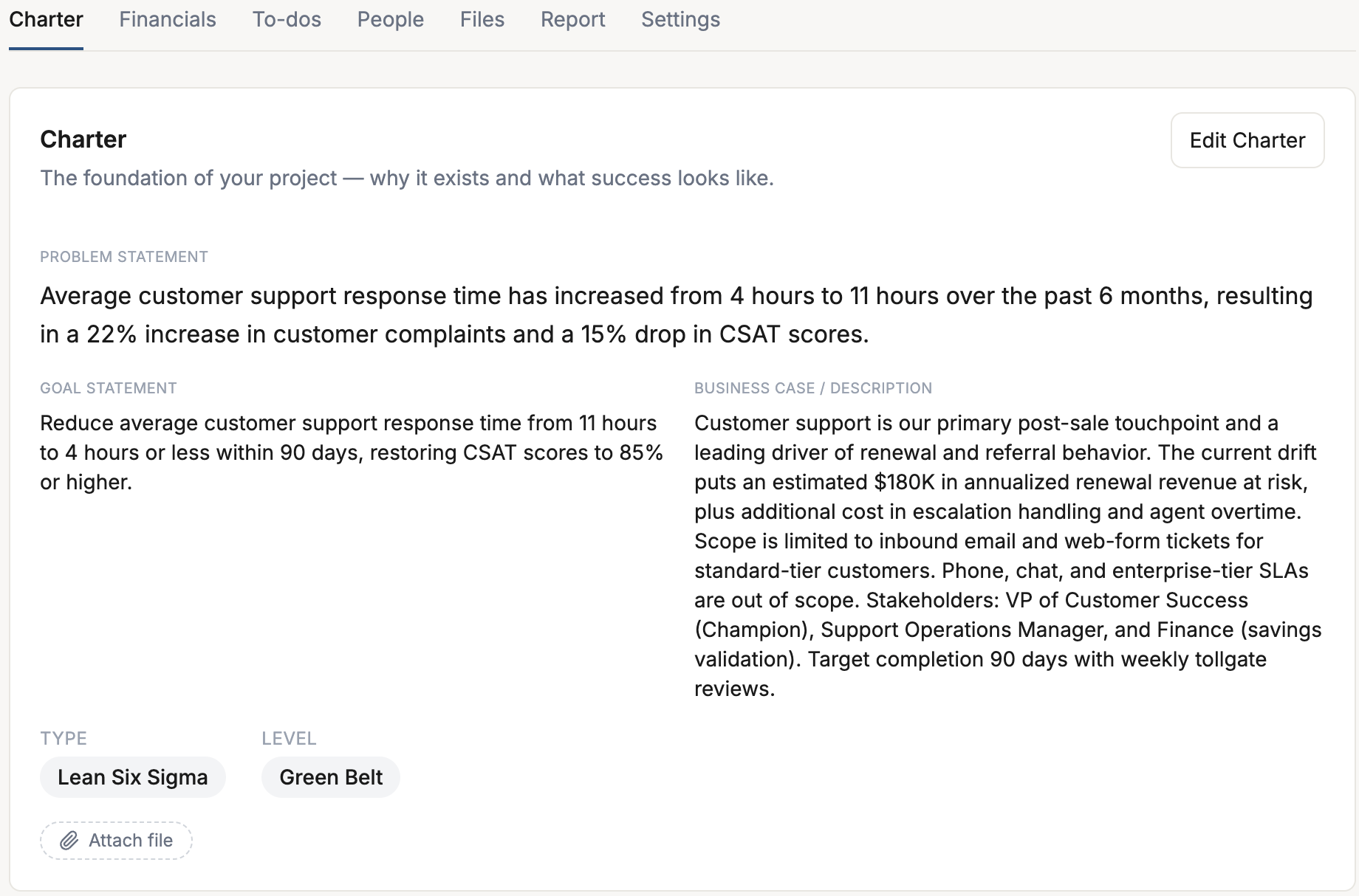 Run your first DMAIC or Kaizen project during training. Charter, milestones, to-dos, and financials — already structured for you.